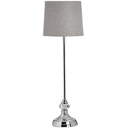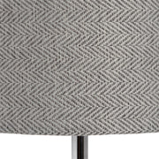 Experience the perfect blend of modern style and classic design with this exceptional table lamp. The sleek chrome base features a meticulously crafted glass accent that catches and reflects light with mesmerizing brilliance. The thoughtfully chosen grey and white herringbone shade adds textural interest while diffusing light beautifully throughout your space. This lamp exemplifies understated luxury that will appeal to discerning customers seeking quality lighting solutions. For a coordinated display that maximizes visual impact, we recommend pairing with our Silver Quarterfoil Decorative Hanging Mirror to amplify the reflective elements, the Antique Grey Large Ceramic Pear for textural contrast, and the Silver Heart Skeleton Wall Clock to echo the metallic finish. This carefully curated combination creates a cohesive aesthetic that your customers will appreciate for its attention to detail and enduring appeal.