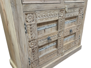 Heavily carved, decorative wooden sideboard. With a Morrocan feel, this light coloured, intricately carved bookcase will be a statement in any room. Exquisitely crafted, this unique piece gives Moroccan vibes that will create a luxe atmosphere in any living space. Make a grand impression with this timeless and artistic accent.